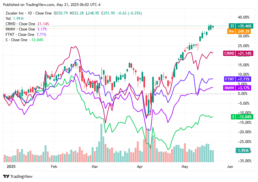On May 20, 2025, Zscaler fell 0.25%, CrowdStrike Holdings dropped 0.47%, while Palo Alto Networks, Fortinet, and SentinelOne posted modest gains under 0.5%.