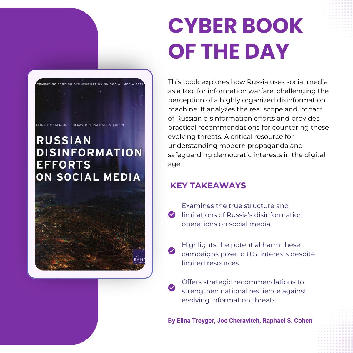 In this edition of Cyber Book Club, we spotlight Russian Disinformation Efforts on Social Media by Elina Treyger, Joe Cheravitch, and Raphael S. Cohen, a comprehensive analysis of Russia's use of social media as a tool for information warfare. This report delves into the structure, strategies, and implications of Russian disinformation campaigns, offering insights into how these efforts impact Western societies and recommendations for countering them.